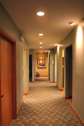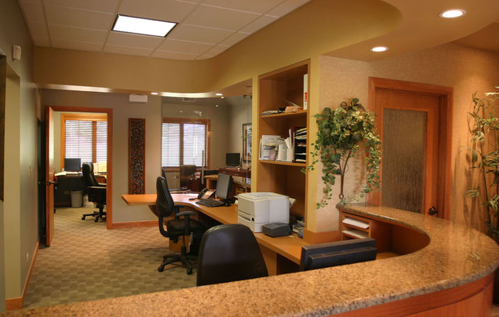This 2,400sf dental office in an upscale community was designed to achieve a “wow” factor immediately upon entering the office. Built in a professional office campus, the level of service and quality are immediately apparent from the time one enters the building, views the inlaid wood reception desk and the rippled glass French doors. A consultation room with full height curved glass wall provides an elegant image as one proceeds to the exam rooms. This office makes one feel at home without being overly grand.